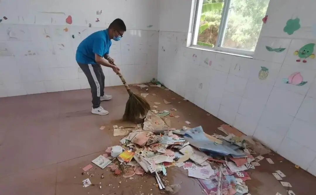 这里原本有一所小学,由于适龄儿童的就学人数越来越少,2020年7月被徐营小学合并,原校址因此被闲置。当支教团入驻河硐小学旧址时,校园内荒草丛生,教室内一片狼藉。为了给孩子们营造良好的学习环境,支教团成员们拿起锄头,扛起扫把,搬运桌椅,又用废弃的门板做成黑板……经过这场“劳动教育”的洗礼,支教团在河硐小学原址顺利开班。