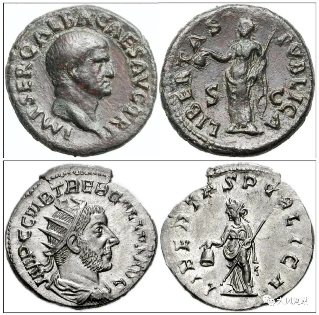 柯沙克文中舉例羅馬皇帝加爾巴“標榜其統治的合憲性”的自由帽獎章,圖片暫未找到,不過,圖~1上圖正是公元68年加爾巴治下的同一題材硬幣,也可作為佐證。此外,羅馬軍團常年征戰,勝利女神維多利亞(Victoria或Victory)更是經常出現在羅馬古幣上。許倬雲思索〈羅馬帝國為何衰亡〉,探討羅馬“軍事佔領的特性”以及“貴族民主制度的本質”,值得對照思考: