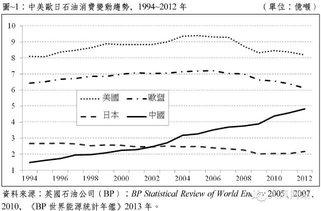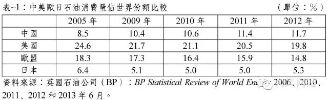 根據英國石油公司(BP)歷年《世界能源統計》,2005年以來美國、歐盟、日本的石油消費量基本呈現下降趨勢,中國石油消費量卻持續大幅上昇(參見圖~1)。以2012年為例,美國和歐盟石油消費量比2011年分別下降2%和4.3%,中國卻上昇了5.3%。相應地,中國石油消費佔世界總量的份額也不斷增加,2012年達到11.7%(參見表~1)。如果算上石油、天然氣、煤炭等所有一次能源在內,2012年中國一次能源消費總量達到27.35億噸標準油當量,已連續三年超越美國,居世界首位。