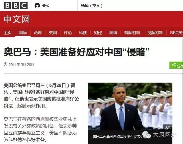 2014年中,BBC新聞大字標題唯恐天下不亂,〈奧巴馬:美國準備好應對中國“侵略”〉,報導美國總統5月28日在西點軍校畢業典禮講話,“無人制止的地區性侵略——在烏克蘭南部、南中國海、或是世界上任何地區——將最終影響到我們的盟國,並且有可能捲入我們的軍隊。”