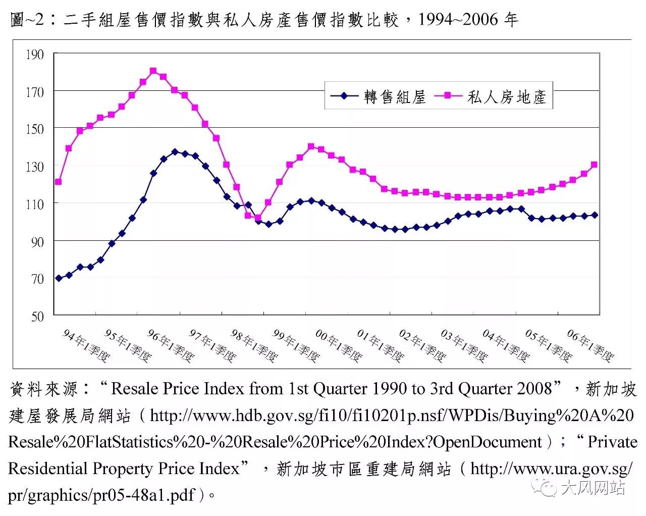 “這一下,把居民住宅消費與普通房地產投機分割成兩個市場。前者一戶一套,更多自住消費;後者來去自由,數量不限,敞開投機。房地產企業的投資、溫州炒房團的炒作、本地居民的保值增值,外國人和先富起來的高檔消費,繼續在對外開放的房地產市場盡情折騰。”(王小強〈關於上海“居者有其屋”的幾點認識〉,《香港傳真》No.2008-55)所以,新加坡的私人房地產市場同樣活躍,其投機性一點不亞於其他國家和地區。正如圖~2所顯示,二手組屋市場的價格,走勢比私人房地產市場更平穩、緩和。