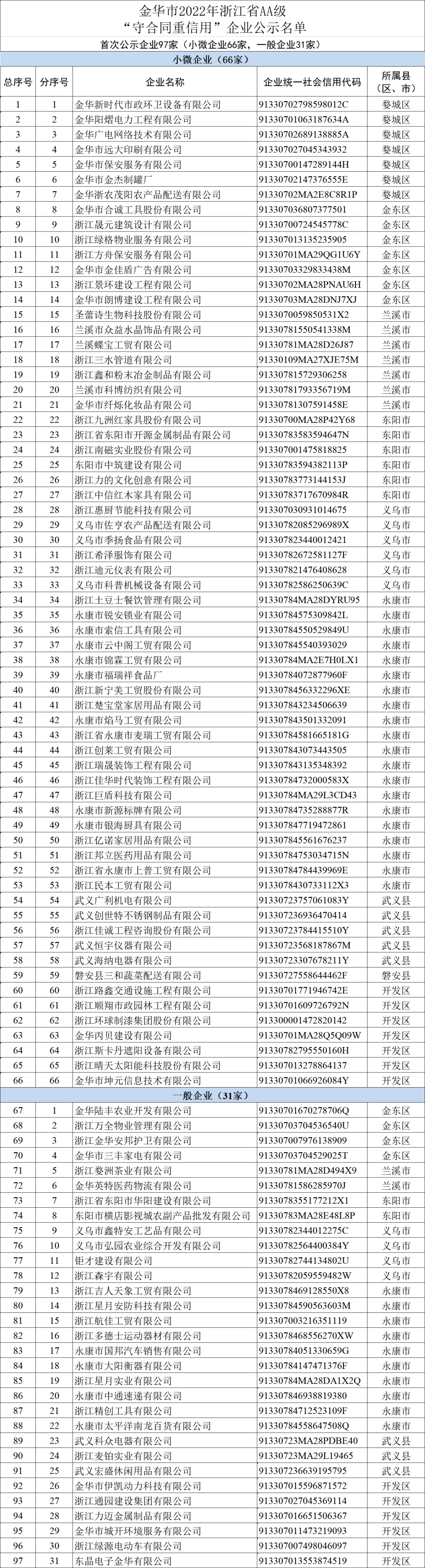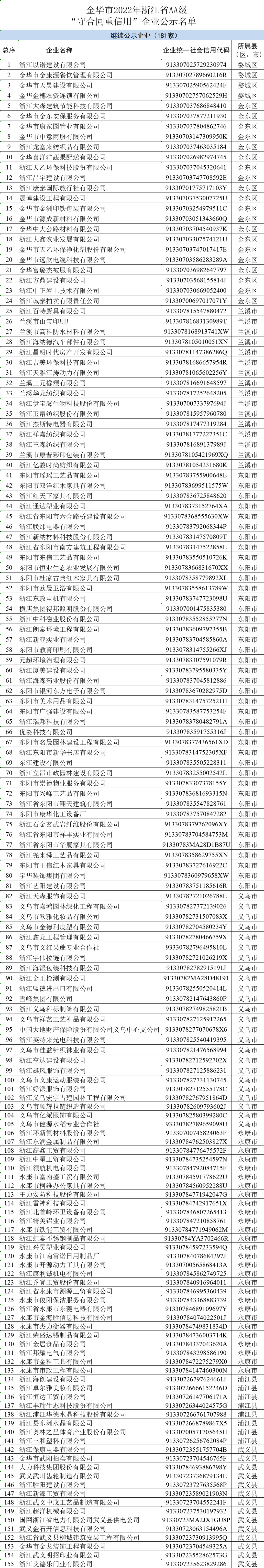 为促进企业加强合同管理和诚信建设,根据《浙江省“守合同重信用”企业公示办法》,经企业自愿申报、各级审核研究 ,金华市市场监管局现向社会公示2022年浙江省AA级“守合同重信用”企业278家,其中首次公示企业97家,继续公示企业181家(见附件),公示期两年。公示期间实行动态管理,接受社会监督。