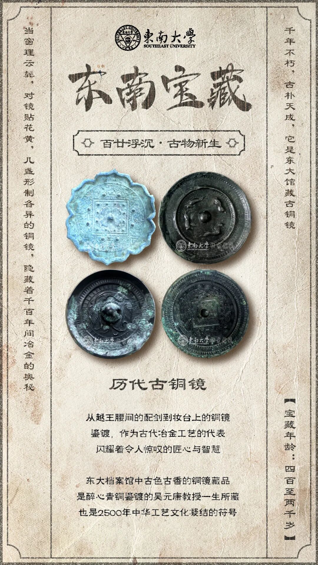 在建党百年时,耄耋之年的吴教授将收藏的213件面历代古铜镜藏品悉数捐赠给东南大学档案馆,展现出东大人对中华文化的热爱与风骨。