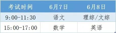 6月7日-6月8日为高考日,上午考试时间9:00-11:30,下午考试时间15:00-17:00。