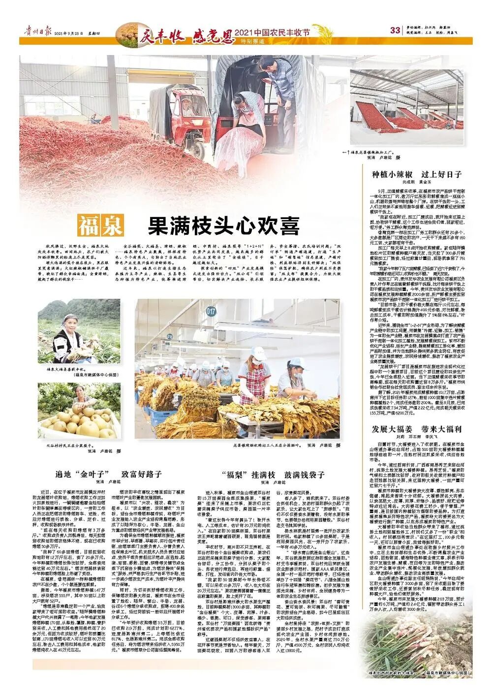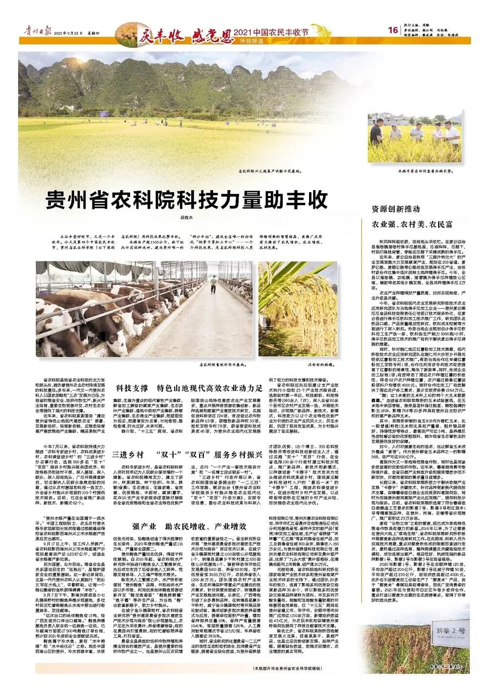 在2021年中国农民丰收节到来之际,《贵州日报》今日推出“2021中国农民丰收节”特别报道“庆丰收 感党恩”。农业是安天下、稳民心的战略产业,具有“压舱石”和“稳定器”的作用。在向第二个百年奋斗目标迈进的历史关口,贵州持续巩固和拓展脱贫攻坚成果,农业供给侧结构性改革深入推进,加快农业农村现代化,粮食播种面积和产量稳定,农产品质量和食品安全水平得到进一步提升,各地全面推进乡村振兴。内容如下: