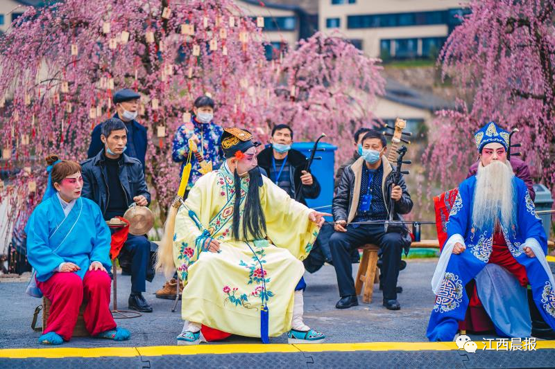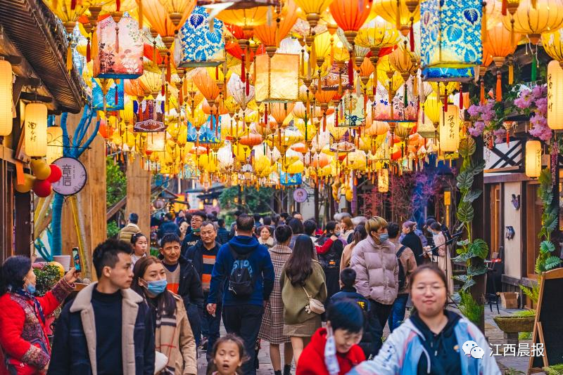 赏春节花灯、食人间烟火,颇有古时游园会的趣味。园区演艺中,福禄寿喜财——五大福神送吉祥,现场向游客发送红包,送吉祥话,祝福游客新的一年万事如意,牛年大吉。经典的赣剧曲目《牡丹对药》受到了老年人的喜爱,同时也向年轻一带传递了浓厚的地方文化。除此之外,还有道士上山、太极与舞、古风弹唱等众多特色节目,让人大呼过瘾。