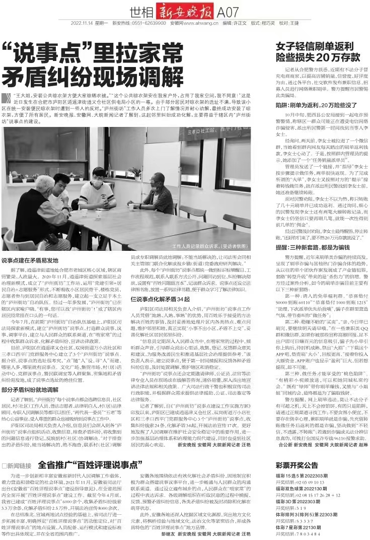 为进一步创新和丰富安徽省新时代人民调解工作载体,着力营造和谐稳定的社会环境,2021年11月,安徽省司法厅出台《安徽省“百姓评理说事点”建设指导意见》,在全省范围内全面开展“百姓评理说事点”建设工作。截至今年4月底,我省已建成“百姓评理说事点”6000余个,收集矛盾纠纷线索3.3万余条,化解矛盾纠纷2.5万件,开展法治宣传8000余次。