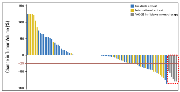 2017年,加拿大的一项研究发现BRAF V600E突变的低级别儿童胶质瘤患者对常规放化疗不敏感,10年的无进展生存率(PFS)为27% ,而BRAF野生型PFS为60.2%。6名BRAF V600E突变的患者在常规治疗疾病进展后使用了BRAF抑制剂,响应显著,肿瘤缩小49%到80%(如下图红框所示),这6名患者后续平均服药18.5个月,这期间疾病稳定。