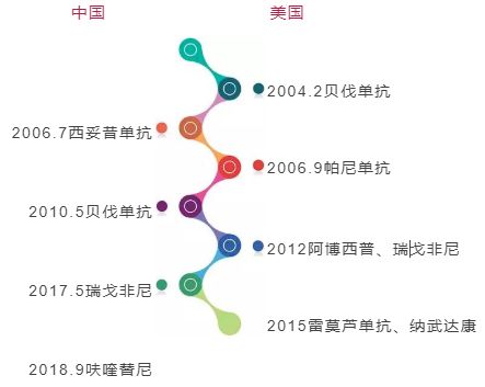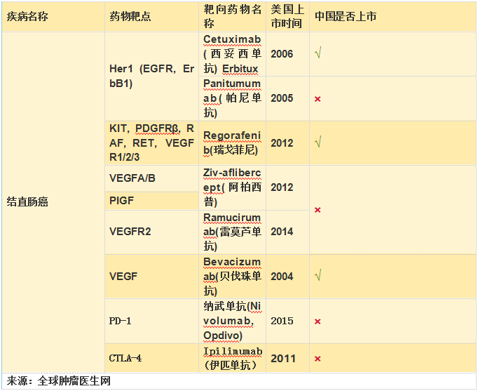西妥昔单抗(Erbitux®),帕尼单抗(Vectibix®),贝伐单抗(Avastin®),ziv-aflibercept(Zaltrap®),瑞戈非尼(Stivarga®),ramucirumab(Cyramza®),nivolumab(Opdivo®),ipilimumab (Yervoy) ®)