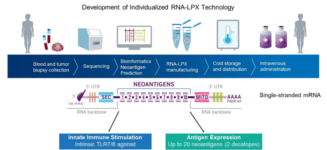 这项研究使用的疫苗代号为RO7198457,是BioNTech公司研发的,是一种基于信使RNA(mRNA)的癌症疫苗,根据每个患者量身定制,制备疫苗前需要通过对肿瘤和血液样品进行测序并鉴定肿瘤特异性新抗原来生产。