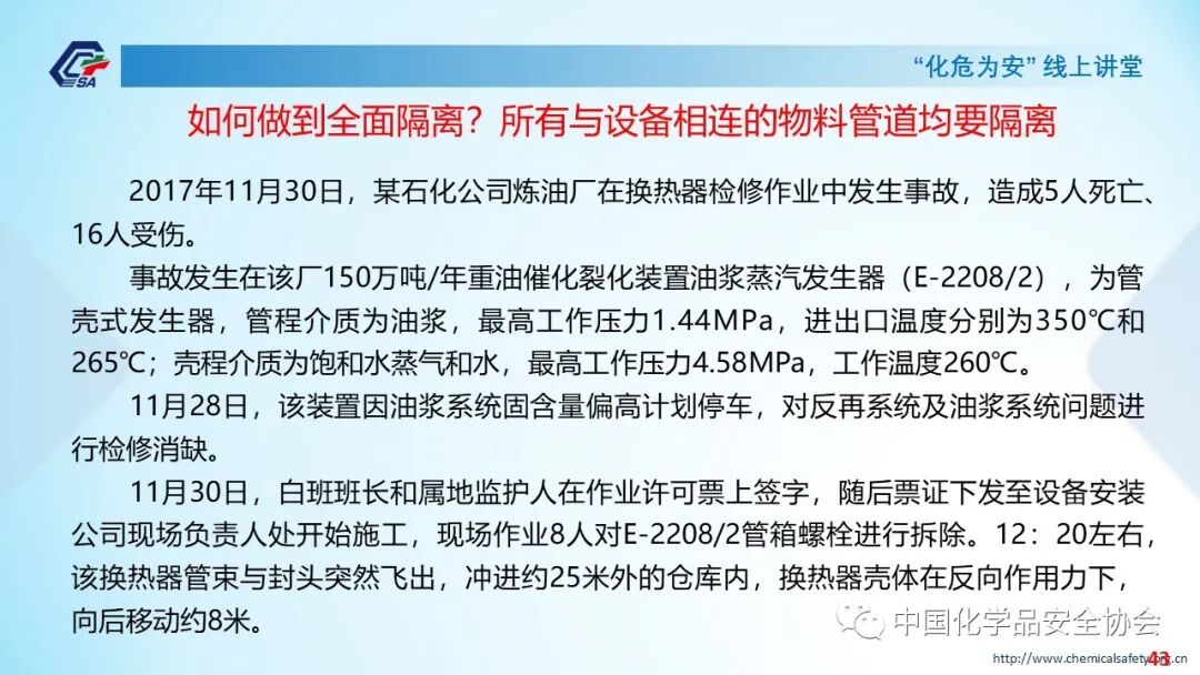 11月6日,中国化学品安全协会“化危为安”线上讲堂第16期顺利播出,本期主题为“严格能量隔离 规范盲板作业 防范安全事故”。