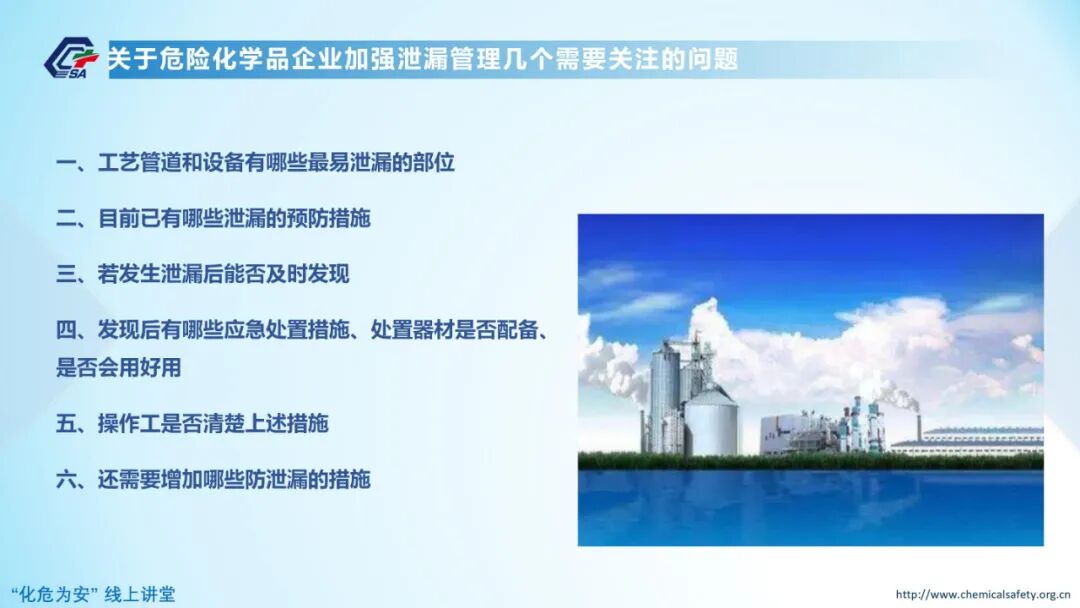 在化工企业发生生产安全事故的原因中,泄漏居于首位。如何开展设备泄漏管理?中国化学品安全协会12月31日举办的第45期“化危为安”线上讲堂为大家详细介绍了方法和要求。