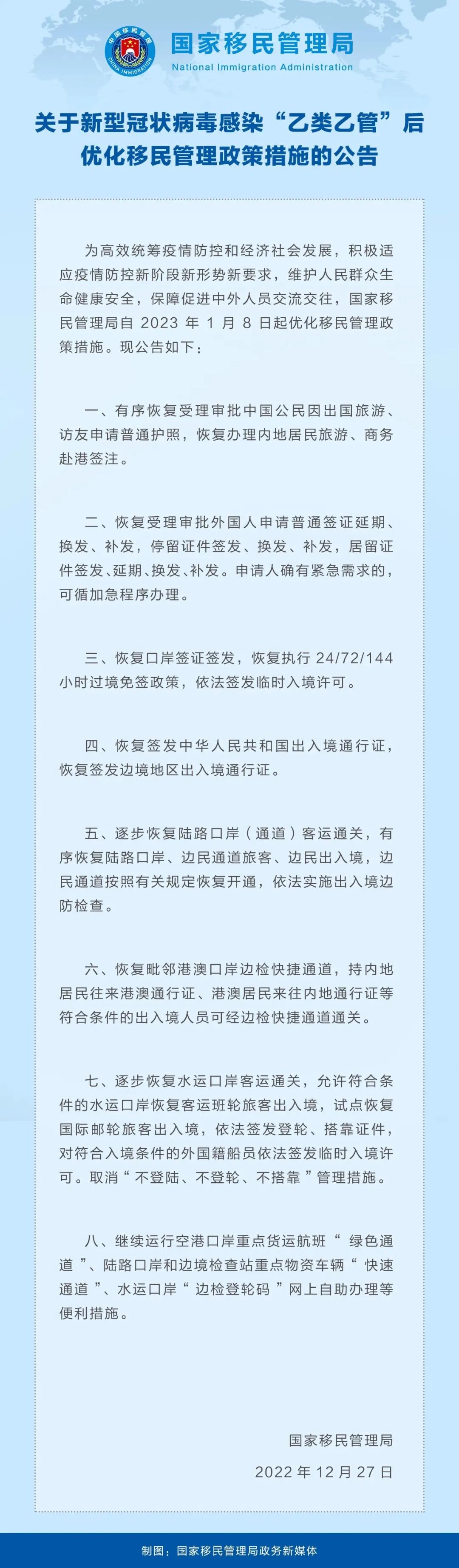 根据国务院联防联控机制有关部署和《中华人民共和国国境卫生检疫法》等法律法规规定,现就新型冠状病毒感染“乙类乙管”且不再纳入检疫传染病管理后有关事项公告如下: