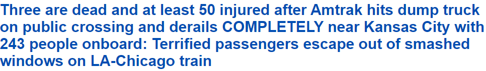 一列从美国洛杉矶开往芝加哥、载有255人的的美铁(Amtrak)列车,在行至密苏里州门敦市(Mendon)附近时与一辆卡车相撞后脱轨。