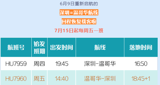 这样一来,大家今后回国时,就再也不用面对酸爽的“捅鼻子”核酸检测了!海南航空近日官宣,从7月15日起,海南航空的HU7959(深圳-温哥华)和HU7960(温哥华-深圳)航线将恢复载客。具体时间为:每周四执飞深圳-温哥华(HU7959),每周五执飞温哥华-深圳(HU7960)。