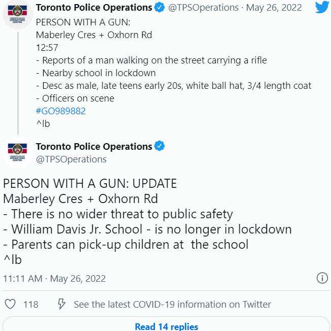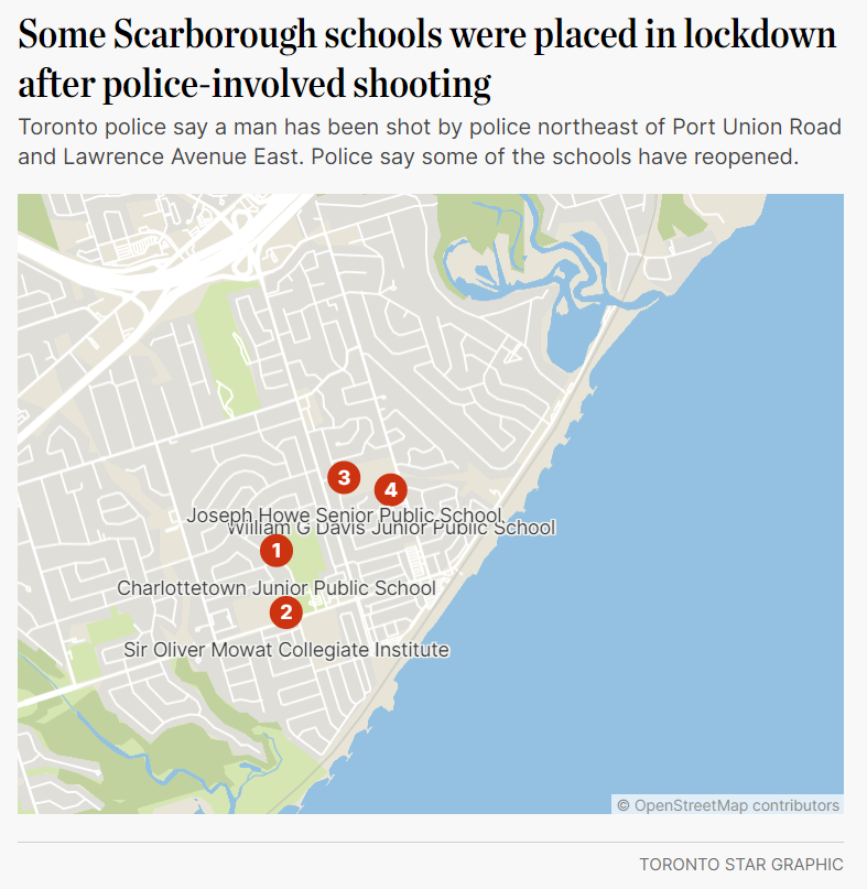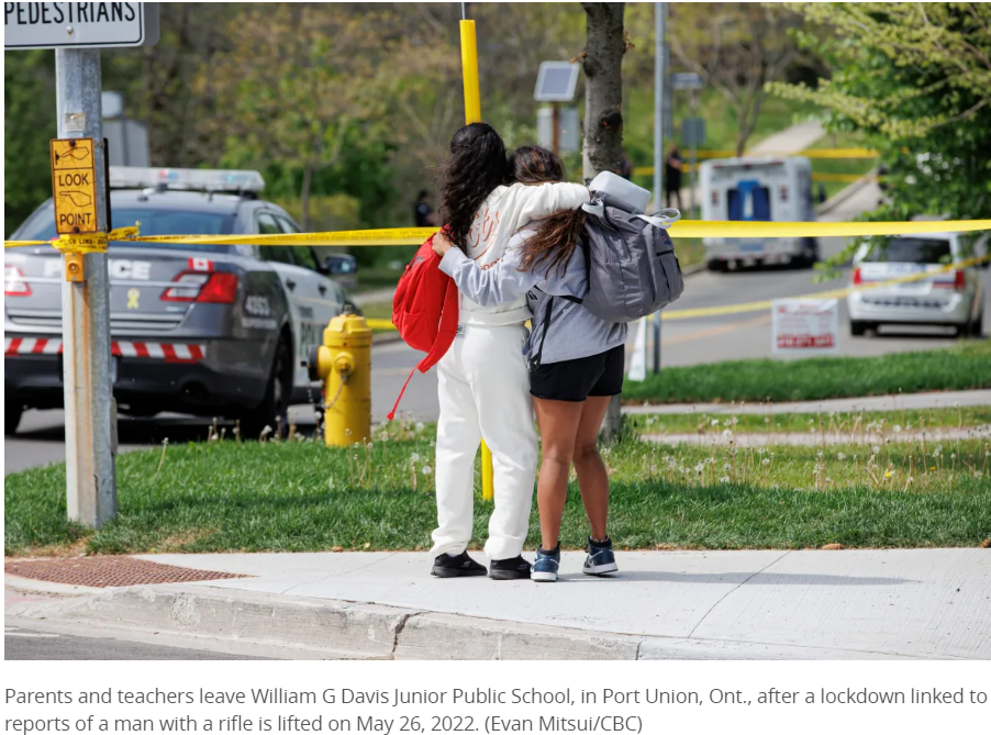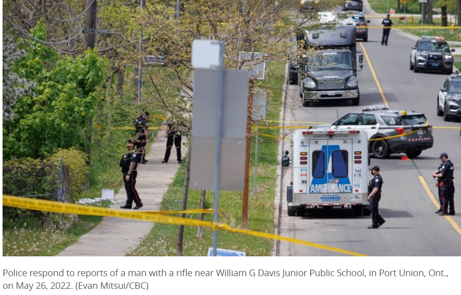 今天(5月26日),多伦多几所学校被迫封锁后,一名男子被警察开枪打死,此前有报道称该地区有人拿着步枪,在学校附近走来走去。
