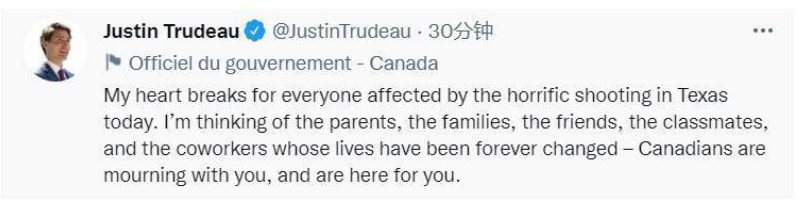 在加拿大,总理特鲁多也表示,他对事件感到心碎。“学生、家长、老师和整个社区的生活都因这一难以想象的事件而永远改变。发生这可怕的事件,整个加拿大都与我们的美国友人一起深感悲痛。”