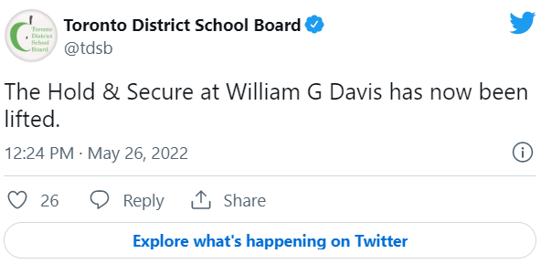 多伦多公校教育局(Toronto District School Board)则推文,William Davis Junior Public School已经解除封锁,有大批家长紧急赶到学校接孩子回家。其他学校也陆续解封。