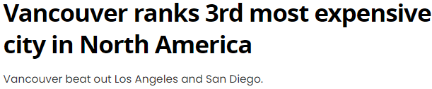 温哥华喜提全球第62位,落后埃德蒙顿和卡尔加里,
