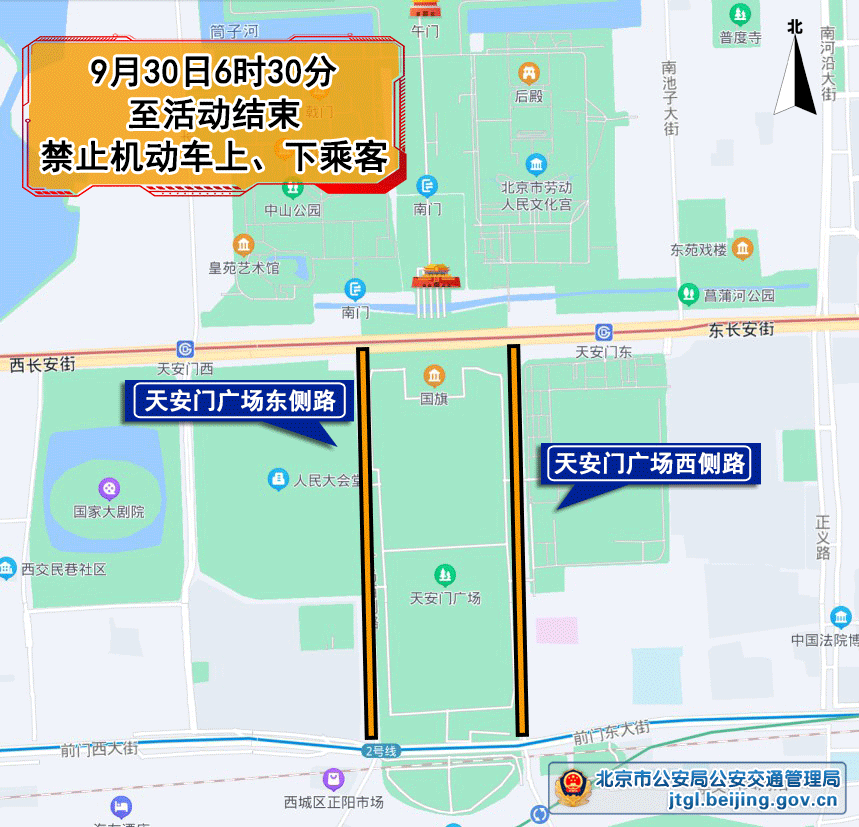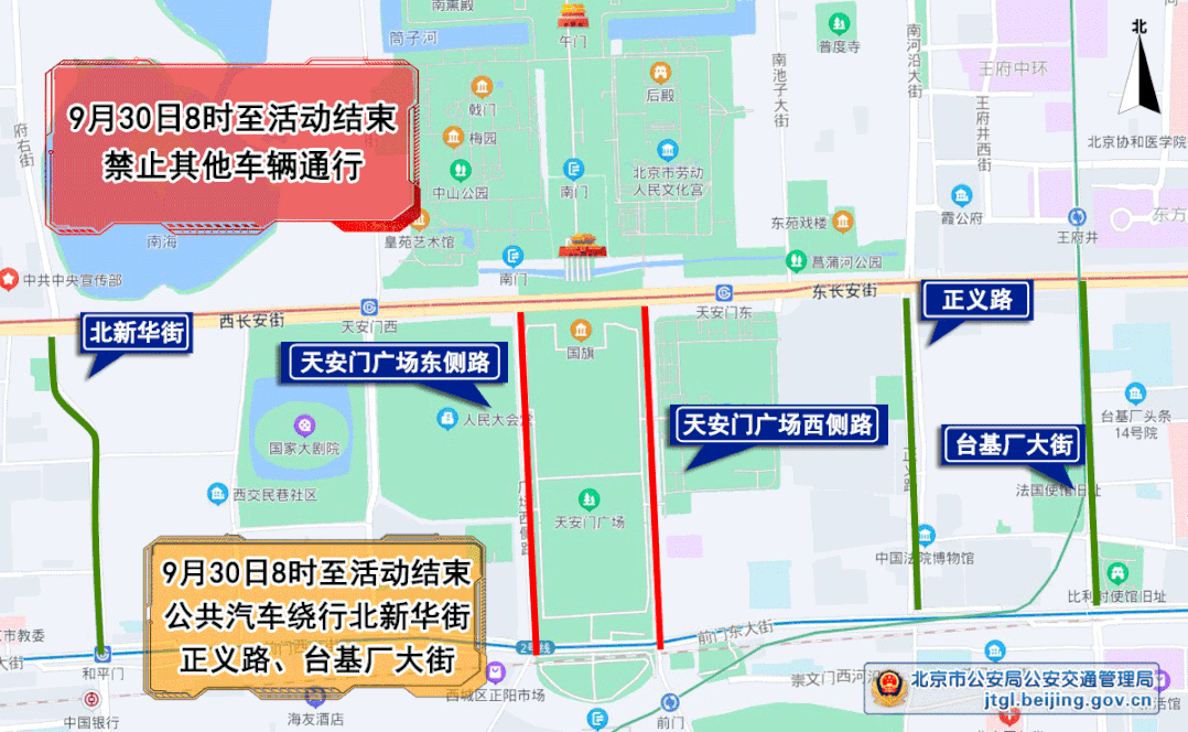 行经天安门广场东侧路、天安门广场西侧路的公共汽车绕行北新华街、正义路和台基厂大街。