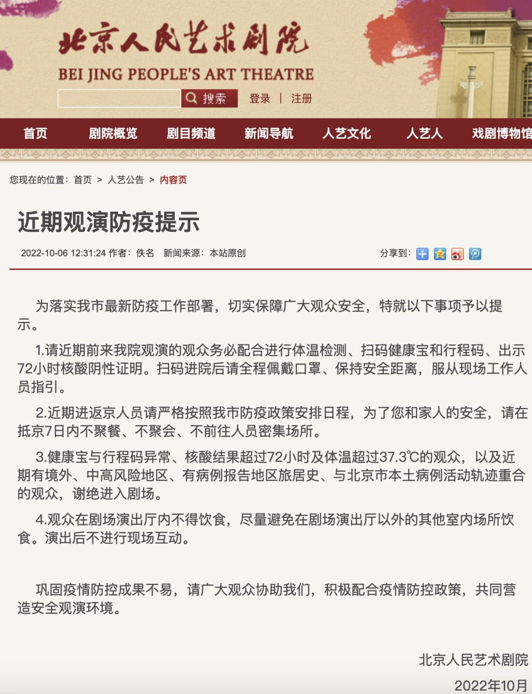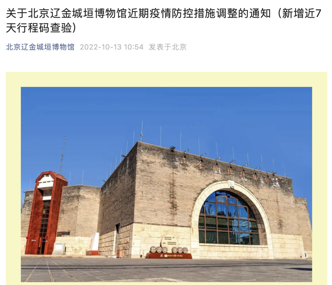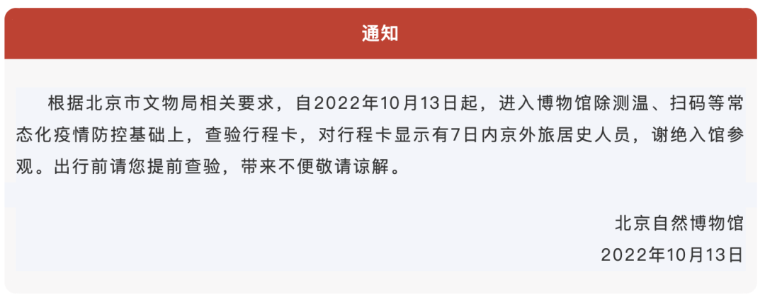 通知称,近期北京连续出现多起输入性疫情,为确保人民群众身体健康,根据上级最新防疫要求,到博物馆参观的观众除须在做好测温扫码、查验72小时核酸阴性证明、正确佩戴口罩等常态化防疫要求基础上,新增加对行程卡的查验工作,对行程卡显示有7日内京外旅居史的人员,暂时谢绝入馆。