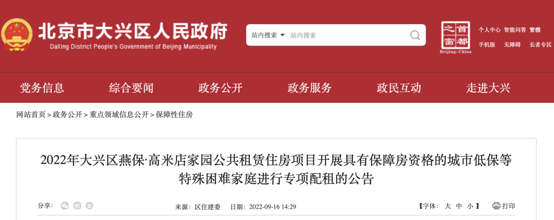 大兴区也于9月16日发布了面向城市低保等特殊困难家庭进行专项配租的公告。其中显示,大兴区本次配租的公租房项目共1个,为燕保·高米店家园,房源共计151套。其中,大套型89套,中套型5套,小套型57套。登记时间为9月19日10时至9月22日12时。