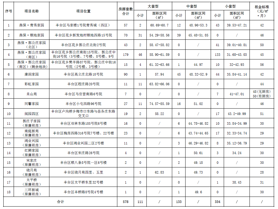 11月4日,北京市丰台区住房保障事务中心发布公告,燕保·郭公庄家园(南区)等18个公租房项目面向丰台区优先家庭开展快速配租。据悉,本次配租的公共租赁住房项目共18个,系项目剩余房源,共计578套,其中大套型111套,中套型133套,小套型334套。