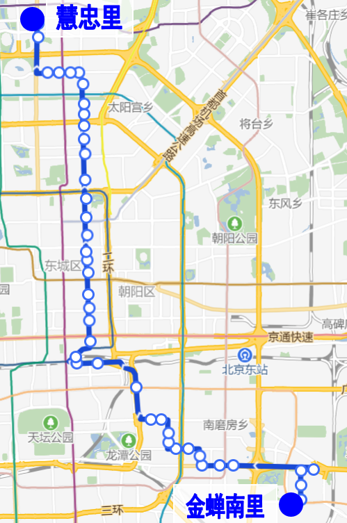 取消站位:惠新西街北口(单向)、惠新东桥南(单向)、惠新东桥西(单向)。