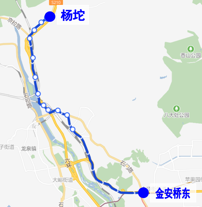 沿途设站:杨坨、军庄中学、灰峪村、军庄、曹家沟、曹家沟南、三家店后街、三家店中街、龙泉宾馆、三家店、三家店东口、石门南路、金安桥西(开往杨坨方向)、金安桥东。