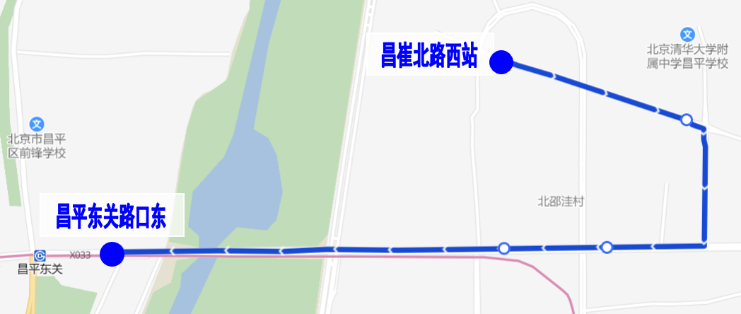 沿途设站:昌崔北路西站、昌崔北路、小北哨、北邵洼、昌平东关路口东。