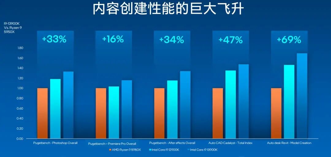 根据官方给出的数据,对比上一代12900K,13900K 的游戏性能最高提升了 24%,生产力工具的性能对比 5950X 最高提升了 69%。