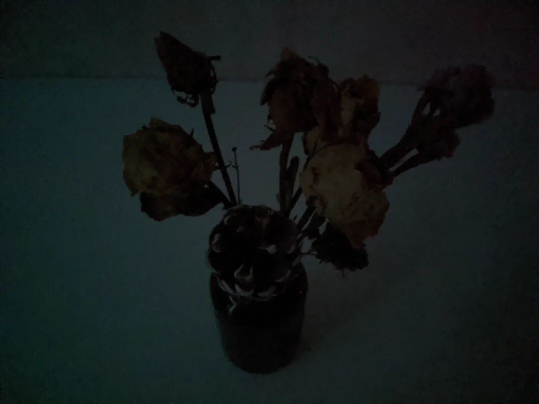这张照片相比起前面两张照片可以说是有了质的提升,不仅画面变纯净了很多,差友们也能看清花瓶里插着的原来是黄色的干花。