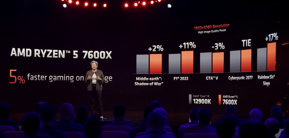 7000 系列 CPU 采用了新的 Zen 4 架构,最多支持 16 个 Zen 4 内核和 32 个线程,最高频率提升到了 5.7 GHz 。不过这一代架构更像是 Zen 3 的迭代,因为未来的 Zen 5 架构将会重新设计。但这并不意味这一代 CPU 就没啥变化,7000 系列是世界上首款用在台式电脑上的 5nm X86 CPU ,得益于台积电的 5nm 工艺,整体的能效比也进一步提升。AMD 表示,其中最强的 7950X 在游戏的表现速度比英特尔目前最快的 i9-12900K 还快 11% ,就连 7600X 也比 12900K 快 5% 。。。