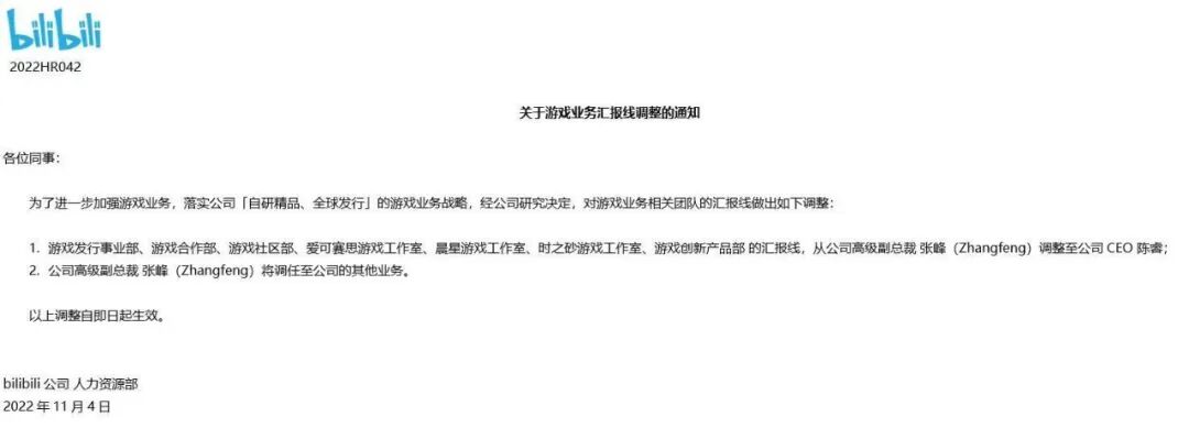 根据邮件显示,游戏发行事业部、游戏合作部、游戏社区部、爱可赛思游戏工作室、晨星游戏工作室、时之砂游戏工作室、游戏创新产品部的汇报线,从公司高级副总裁张峰,调整至公司 CEO 陈睿。原先负责哔哩哔哩游戏业务的张峰,将调整至公司的其他业务。