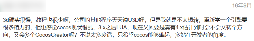 翻了翻现在开发者们对 Cocos 跟 Unity 的评价,很多开发者仍然被 Cocos 完全免费,代码开源而吸引,也开始使用他们的 3D 服务,但 Cocos 的 3D性能,3D 生态,技术资源欠缺,也是他们眼里避不开,绕不过的缺点。
