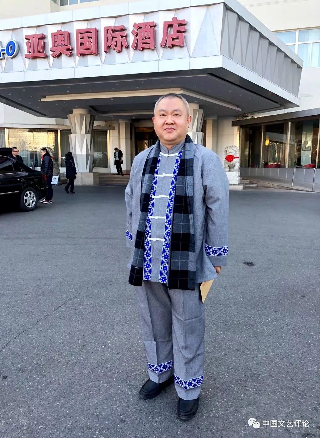 △重庆评协秘书长卫洪身着民族服装、手持邀请函在驻地宾馆前留影
