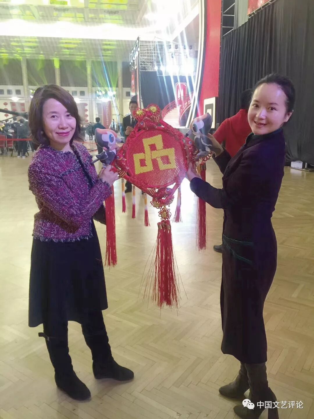 △评论家代表刘琼、慕羽手持带中国评协“品”字LOGO的中国结和毛绒萌版“啄木鸟”在2019年度百花迎春现场