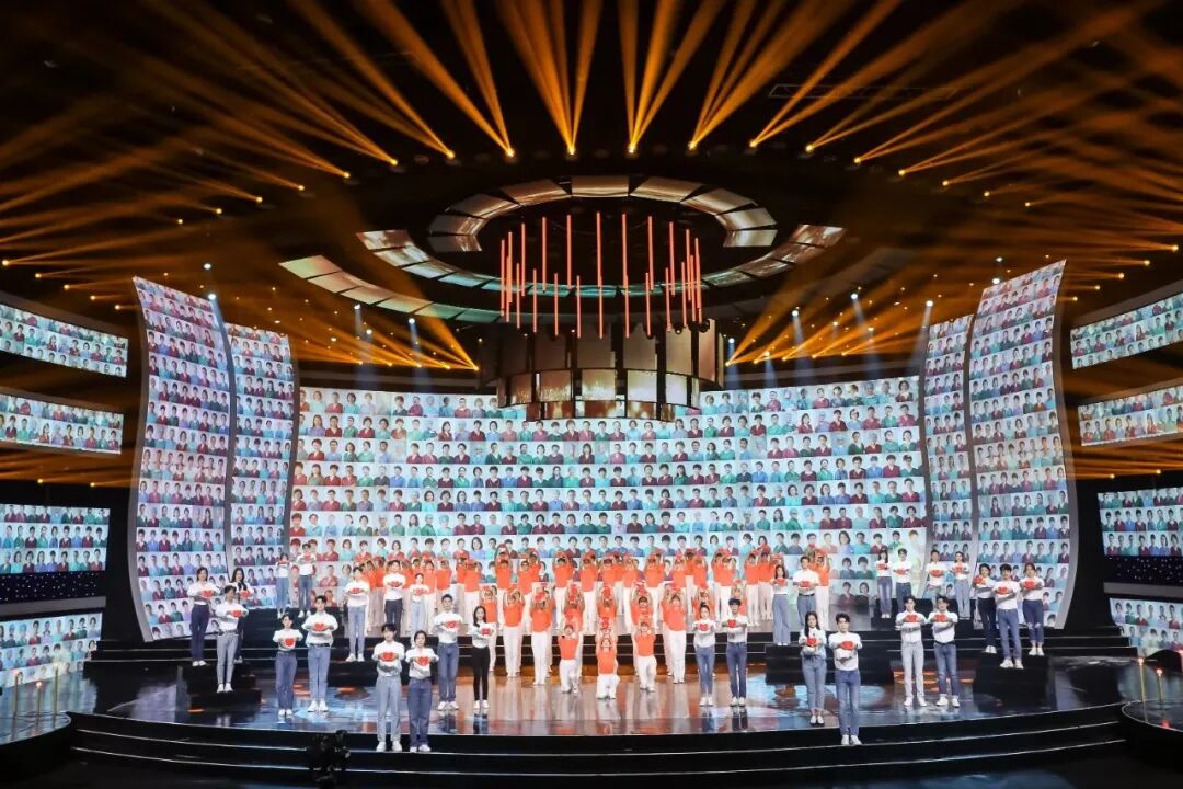 这种先“颂”后“报”的递进结构,清晰简洁,并形成了一以贯之、绵延回荡的力量。在这一大结构中,将13个文艺家协会拜年、艺术家代表拜年以及艺术家采访散点穿插其中,信息量更大,也使整个演出更为丰富和饱满。在色彩上,因为上一篇章“颂”的内容多为红色经典,在舞美、灯光和服化道上,整个色彩偏浓偏重,大色块的红和较富有质感的服装、造型,让这一部分充盈着戏剧感、历史感;下一篇章表现的是改革开放之后的内容,在色彩上更为清新、时尚和现代,LED屏上摄影家、美术家的山水田园作品,也营造着绿水青山,如诗如画的今日中国。摄影家们为疫情一线的42000多名医护人员逐一拍下的肖像为晚会写下浓墨重彩的一笔。42000多次快门,留下的不仅仅是一张张脸,更是2020年这一特殊年份中最为独特和可贵的“中国表情”!