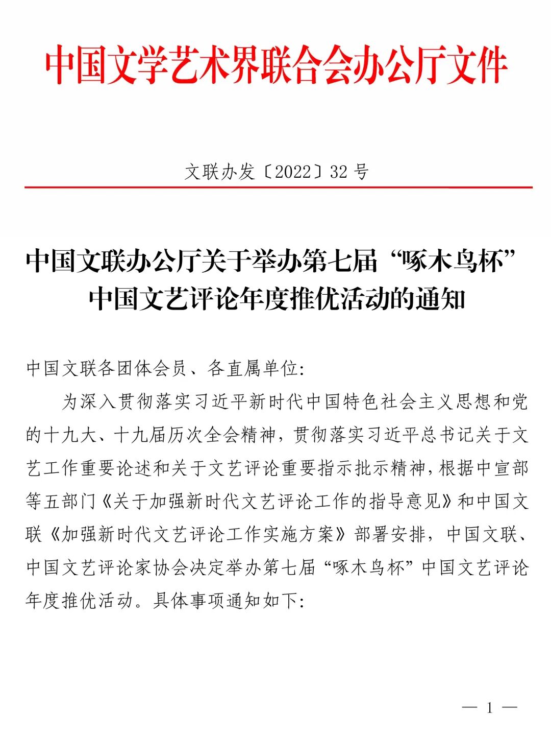 为深入贯彻落实习近平新时代中国特色社会主义思想和党的十九大、十九届历次全会精神,贯彻落实习近平总书记关于文艺工作重要论述和关于文艺评论重要指示批示精神,根据中宣部等五部门《关于加强新时代文艺评论工作的指导意见》和中国文联《加强新时代文艺评论工作实施方案》部署安排,中国文联、中国文艺评论家协会决定举办第七届“啄木鸟杯”中国文艺评论年度推优活动。具体事项通知如下: