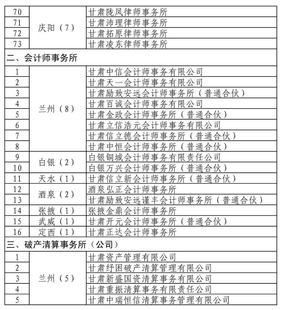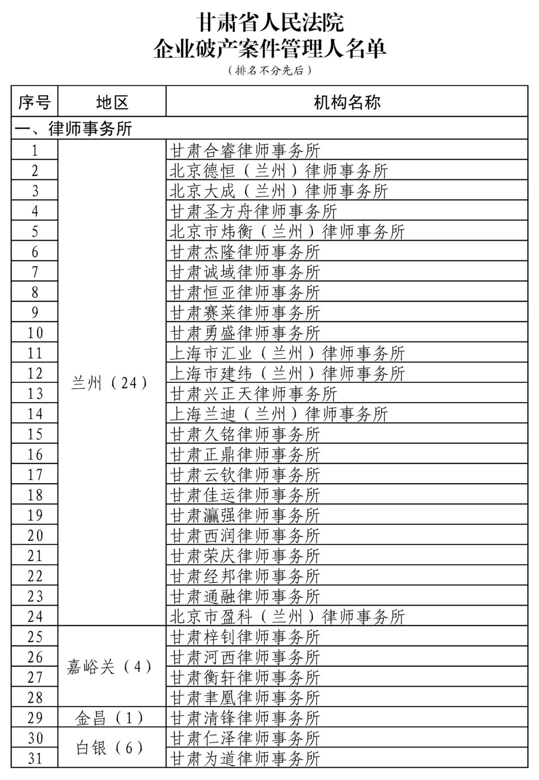 根据最高人民法院《关于审理企业破产案件指定管理人的规定》,按照《甘肃省高级人民法院关于编制企业破产案件管理人名册的实施方案》《甘肃省高级人民法院关于编制企业破产案件管理人名册的公告》要求,我省法院企业破产案件管理人申报遵循属地原则,坚持公开、公平、公正,经初审、复审、测评、外调、查询等环节,现将企业破产案件管理人审核结果进行公示(名单附后)。