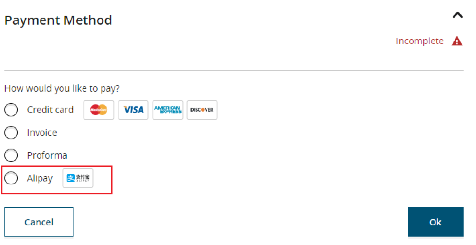 当您通过中国境内IP地址访问Wiley Author Service网站进行开放获取文章出版费(APC)支付并且填写的支付地址为中国境内地址时,只需要在选择付款方式时勾选“Alipay支付宝”即可轻松付款并在完成付款后申请中国税务发票!(下图红色框内选项。)