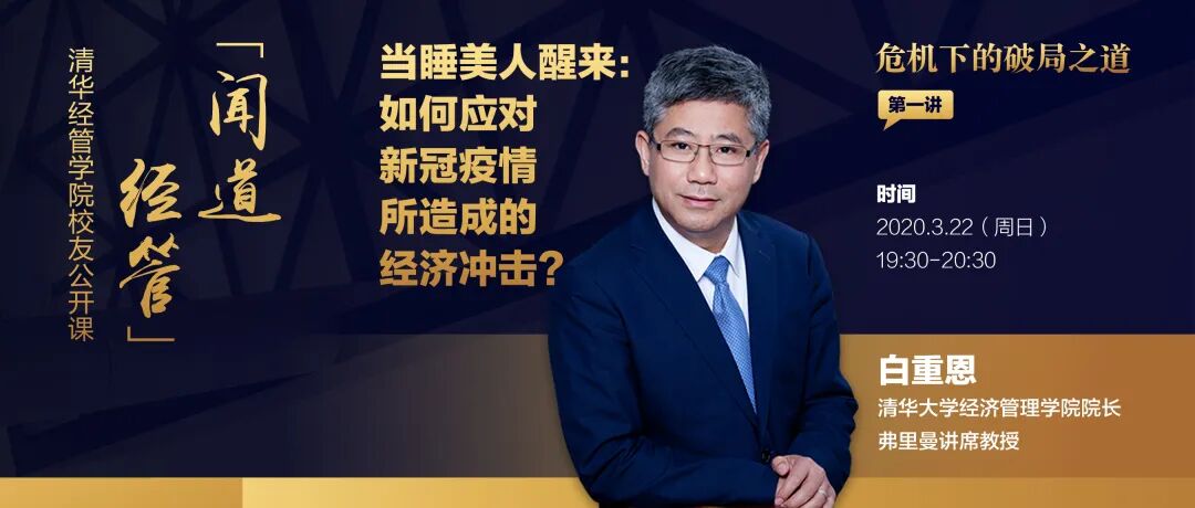 清华大学经济管理学院弗里曼经济学讲席教授、院长白重恩将带来“当睡美人醒来:如何应对新冠疫情所造成的经济冲击?”主题在线课程,校友专属通道、清华大学经济管理学院官方微博将联合央视财经、人民网人民视频、新浪财经、腾讯新闻、网易财经、央视频、一点资讯、快手、抖音同步在线直播,邀您一同探讨危机下的破局之道!