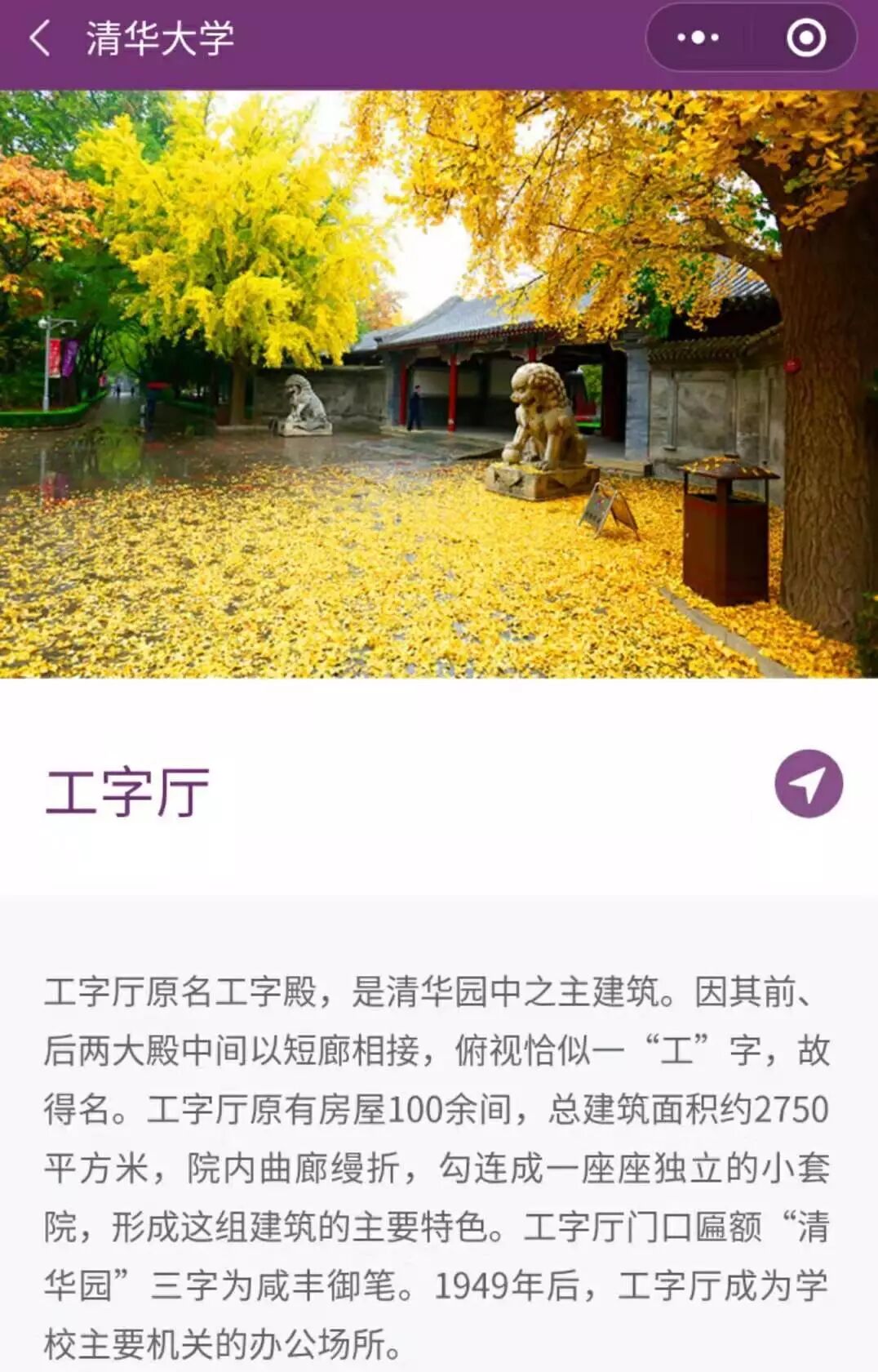 只需关注「清华大学」微信公众号,点击「校园导览」,清华美景就能尽收眼底~