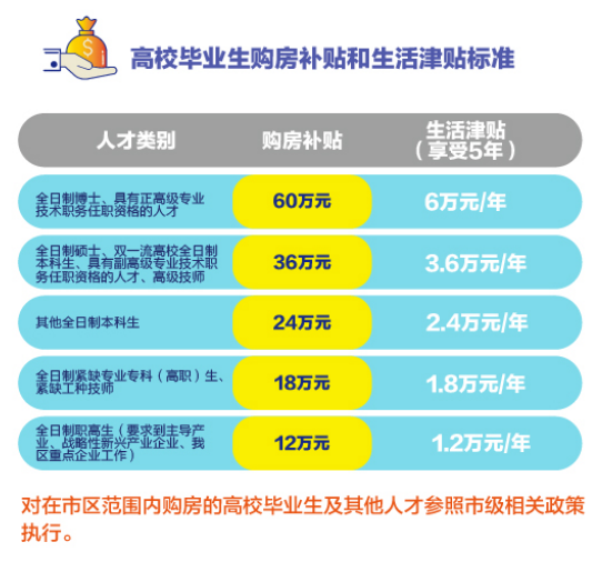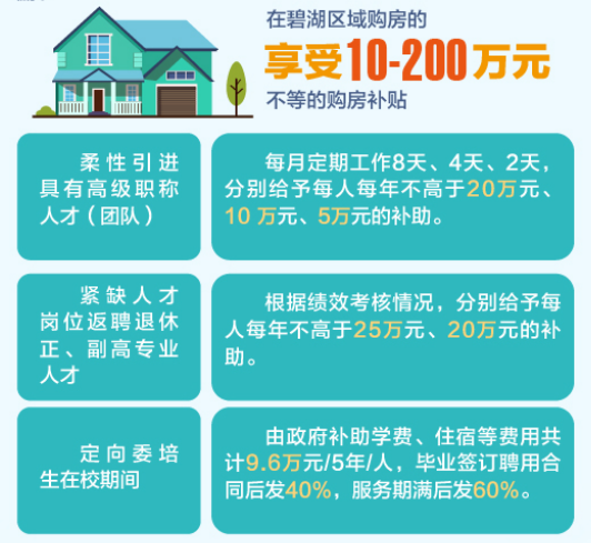 大力实施人才安居工程。对首次引进到碧湖区域工作并在该区域购房的各类人才,给予12-500万元不等的一次性购房补贴和每年1.2-60万元不等的生活津贴,享受5年。