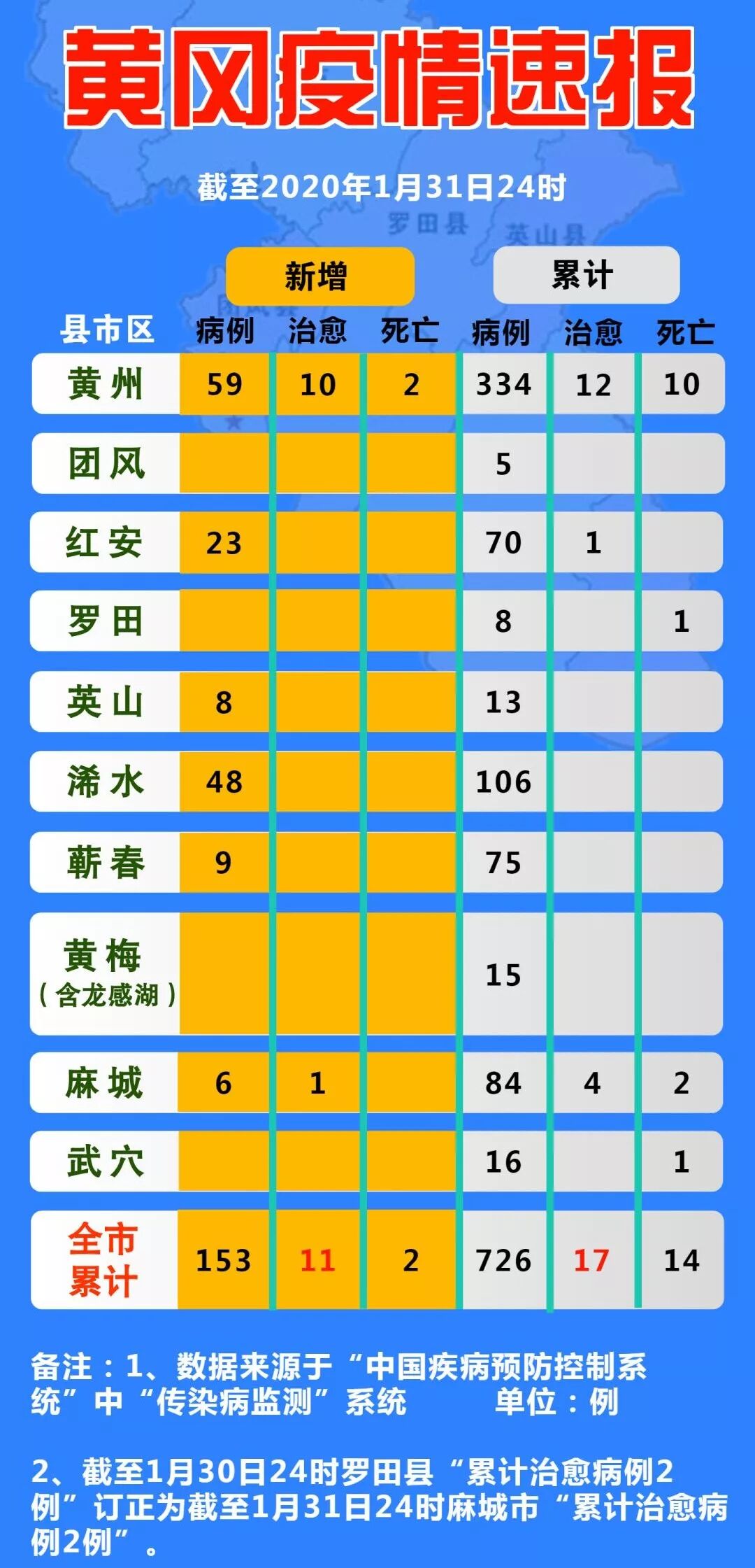 3.31日黄冈新增病例153例,累计726例
