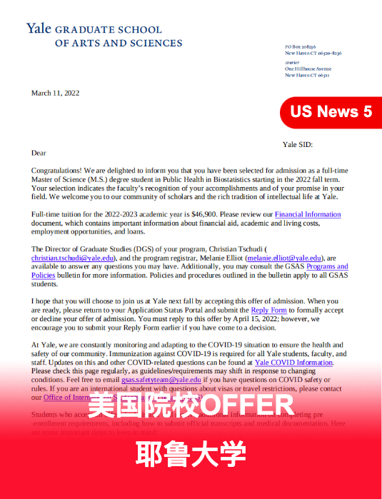 2022年春季录取成果喜人,小苒在金吉列留学的帮助下,成功斩获耶鲁大学offer。小苒本科毕业于国内的双一流大学(本科拿到了国内双一流大学和加拿大名校的双学位),有着光电所研究以及在四大会计师事务所内实习的经历,本科期间辅修数学成了她成功申请生物统计的优势。纵然小苒学习成绩优异,但在遇到金吉列留学之前,她与很多申请者一样,认为耶鲁是一个可望而不可即的存在。在制定院校方案时,顾问老师在综合分析学生的条件之后,结合多年的申请经验,将耶鲁的生物统计列入冲刺院校的名单。同时也在定校方案中规划出合理的保底院校,为学生量身定做了科学、合理的院校方案,最终助力小苒成功进入常青藤梦 校。