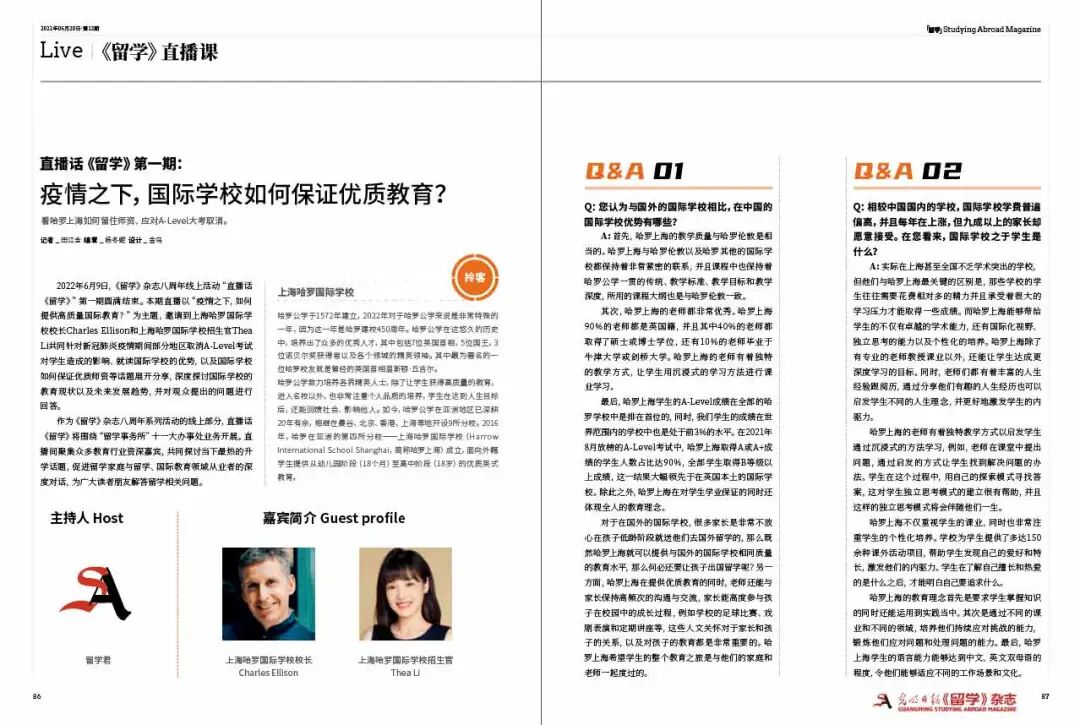 2022年6月9日,《留学》杂志八周年线上活动“直播话《留学》”第一期圆满结束。本期直播以“疫情之下,如何提供高质量国际教育?”为主题,邀请到上海哈罗国际学校校长Charles Ellison和上海哈罗国际学校招生官Thea Li共同针对新冠肺炎疫情期间部分地区取消A-Level考试对学生造成的影响、就读国际学校的优势,以及国际学校如何保证优质师资等话题展开分享,深度探讨国际学校的教育现状以及未来发展趋势,并对观众提出的问题进行回答。
