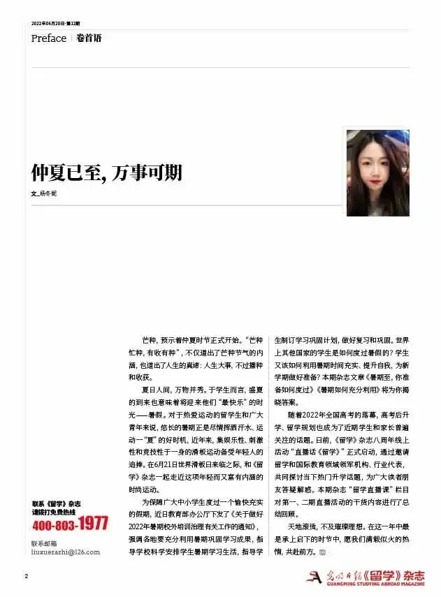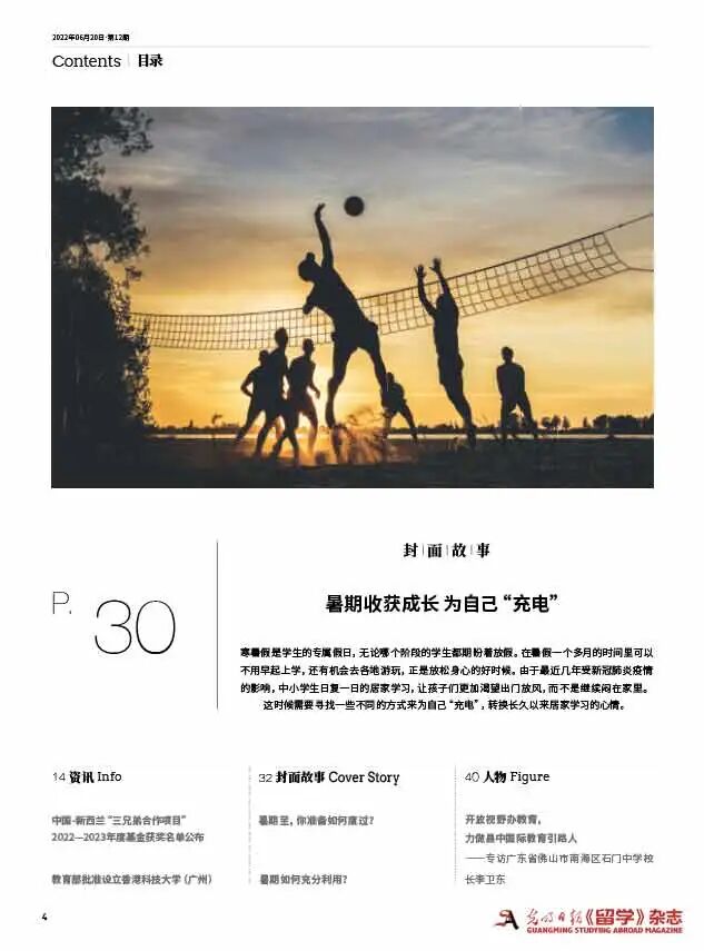 夏日人间,万物并秀。于学生而言,盛夏的到来也意味着将迎来他们“最快乐”的时光——暑假。为保障广大中小学生度过一个愉快充实的假期,近日教育部办公厅下发了《关于做好2022年暑期校外培训治理有关工作的通知》,强调各地要充分利用暑期巩固学习成果,指导学校科学安排学生暑期学习生活,指导学生制订学习巩固计划,做好复习和巩固。世界上其他国家的学生是如何度过暑假的?学生又该如何利用暑期时间充实、提升自我,为新学期做好准备?本期杂志文章《暑期至,你准备如何度过》《暑期如何充分利用》将为你揭晓答案……