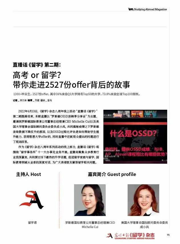 2022年罗斯德OSSD录取成绩十分亮眼,共有超过1300名毕业生收到2527份offer,其中36%来自QS大学排名Top50的大学,73.8%来自全球Top100学校。众所周知,世界排名前100的大学中,中国仅有6所学校上榜:清华大学、北大大学、复旦大学、上海交通大学、浙江大学、中国科学技术大学。也就是说,罗斯德有1000名毕业生拿到了和这6所学校同等级别的大学offer。正当学生与家长焦急等待高考录取分数线、犹豫是否要出国留学的时候,罗斯德用一份亮眼的答卷为迷茫中的他们提供了全新的思路。本期直播活动,揭秘疫情之下罗斯德录取数据不降反升的原因,以及OSSD过程化评估是如何帮助学生提升能力、获得理想大学offer的。