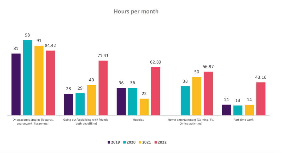 当被问及平均每个月对不同活动的时间安排时,数据结果显示,“学习”是受访者每月花费时间最多的活动,平均每月84.5小时用于学习,但这一数字较2021年的91小时有所下降。花费时间第二多的项目是社交(线上+线下),学生平均每月花费在社交上的时间为71.41小时,社交时间较21年平均每月增加了31.41小时。而时间增长幅度最大的项目是用于兴趣活动的时间(包括看体育节目、运动、志愿服务、艺术创作等),学生平均每月花费62.89小时,较去年增长了40.89小时。